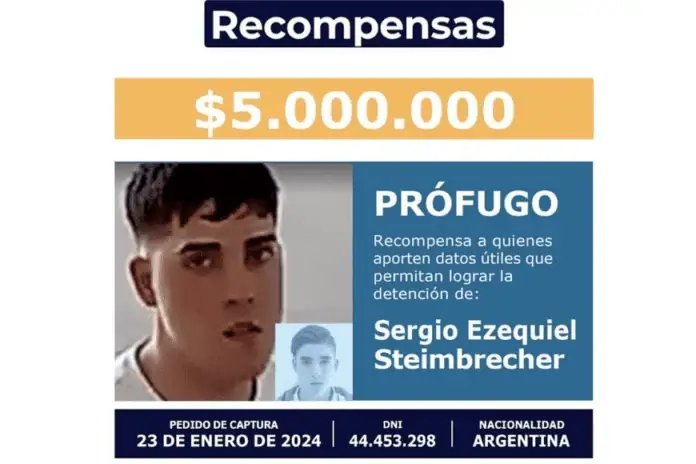 El Ministerio de Seguridad de la Nación lanzó una recompensa de $5 millones para quienes aporten información que permita capturar a Sergio Ezequiel Steimbrecher, de 22 años, acusado de participar en el homicidio del empresario Germán Augusto Sallemi, ocurrido en enero de 2024 durante una falsa operación de compra de dólares en Tigre.