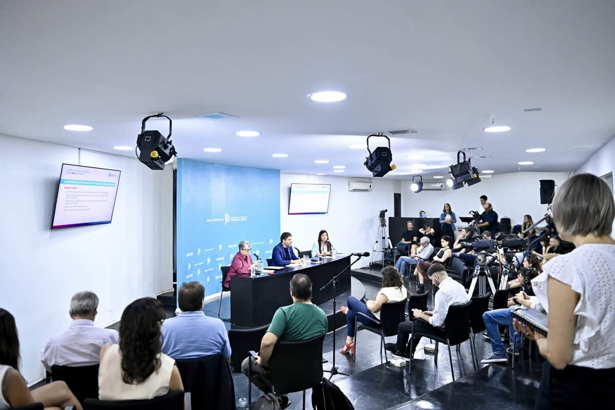 Funcionarios del gobierno de Axel Kicillof brindaron este lunes una conferencia de prensa en la Sala de Conferencias de la Gobernación, en La Plata, donde destacaron la continuidad de la obra pública provincial, cuestionaron recortes del Gobierno nacional en educación y rechazaron el intento de modificar la Ley de Glaciares. Del encuentro participaron el ministro de Gobierno, Carlos Bianco; la ministra de Ambiente, Daniela Vilar; y la directora general de Cultura y Educación, Flavia Terigi.